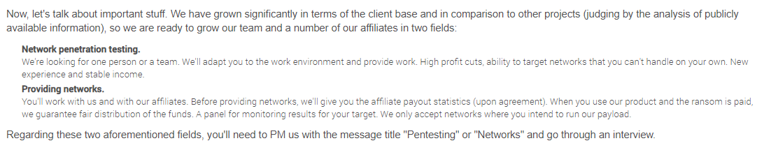 “Network penetration testing. We’re looking for one person or a team. We’ll adapt you to the work environment and provide work. High profit cuts, ability to target networks that you can’t handle on your own. New experience and stable income. When you use our product and the ransom is paid, we guarantee fair distribution of the funds. A panel for monitoring results for your target. We only accept networks where you intend to run our payload.”