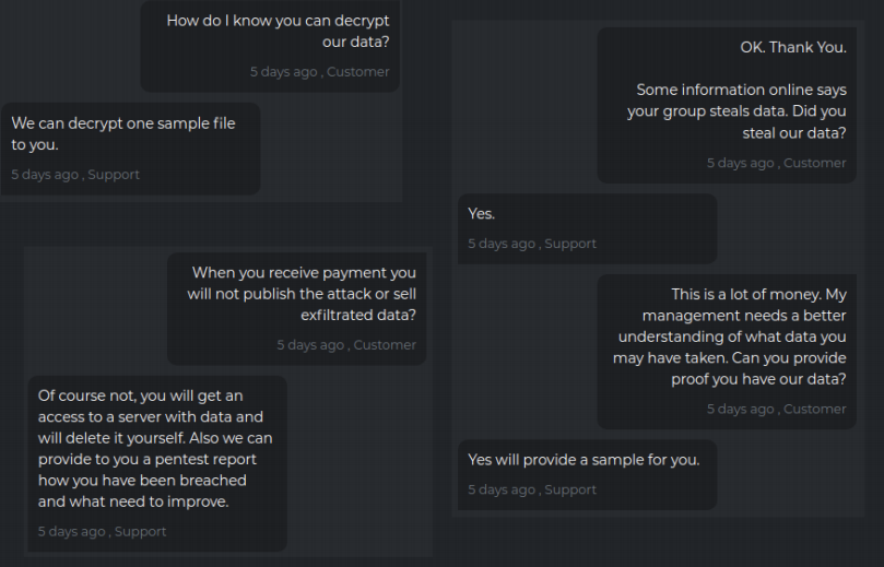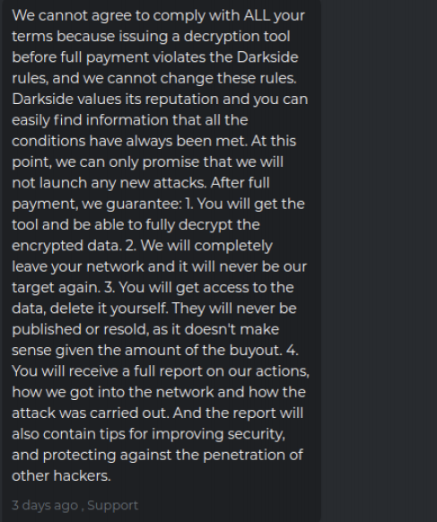 The first exchange between DarkSide and the victim involved the usual back-and-forth establishing of trust, wherein the victim asks for assurances that stolen data will be deleted after payment.