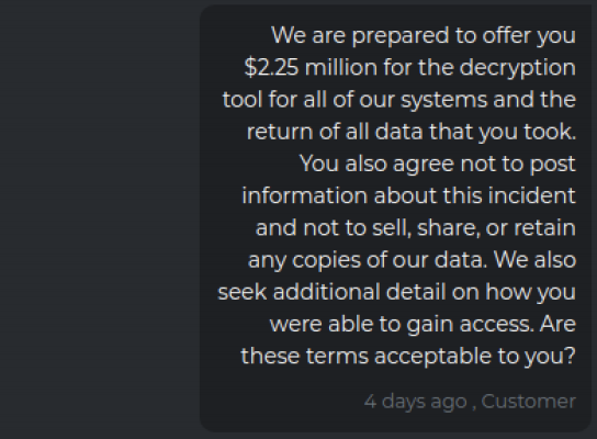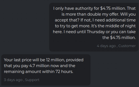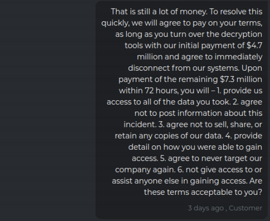 The victim replies that this is still a huge amount, and it tries to secure additional assurances from the ransomware group if it agrees to pay the $12 million, such as an agreement not to target the company ever again, or give anyone access to its stolen data. The victim also tried to get the attackers to hand over a decryption key before paying the full ransom demand.