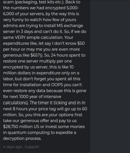 “The timer it [sic] ticking and in in next 8 hours your price tag will go up to $60 million,” the crooks replied. “So, you this are your options first take our generous offer and pay to us $28,750 million US or invest some monies in quantum computing to expedite a decryption process.”