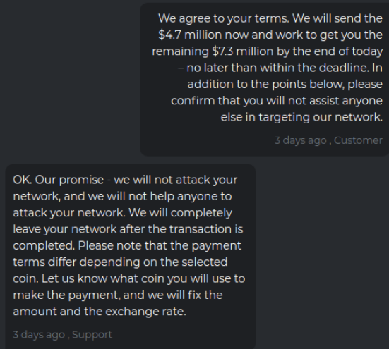 The crime gang responded that its own rules prohibit it from giving away a decryption key before full payment is made, but they agree to the rest of the terms.