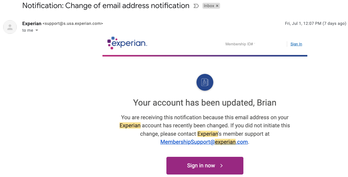 Experian’s system then sent an automated message to the original email address on file, saying the account’s email address had been changed. The only recourse Experian offered in the alert was to sign in, or send an email to an Experian inbox that replies with the message, “this email address is no longer monitored.”