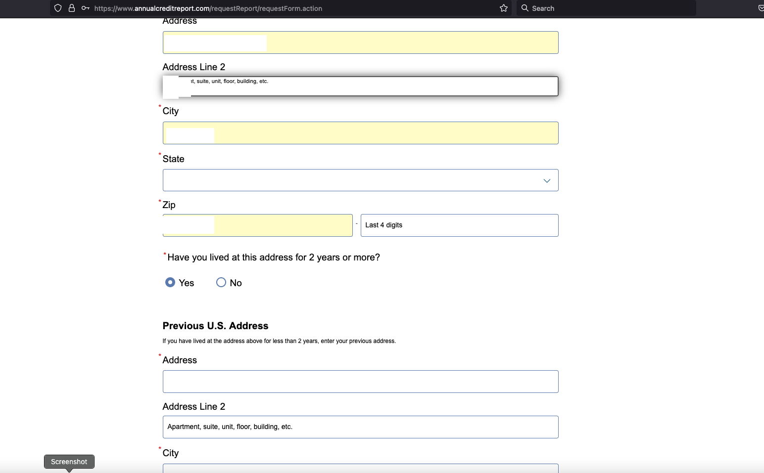 Annualcreditreport.com begins by asking for your name, address, SSN and birthday. After I supplied that and told Annualcreditreport.com I wanted my report from Experian, I was taken to Experian.com to complete the identity verification process.