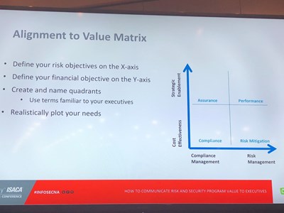 Security leaders must understand the cost and benefit of their objectives, and frame reporting of results or requests for resources in the context of business executives, Rock continued. He then shared an ‘alignment to value’ diagram (below) that can aid security leaders in achieving this.