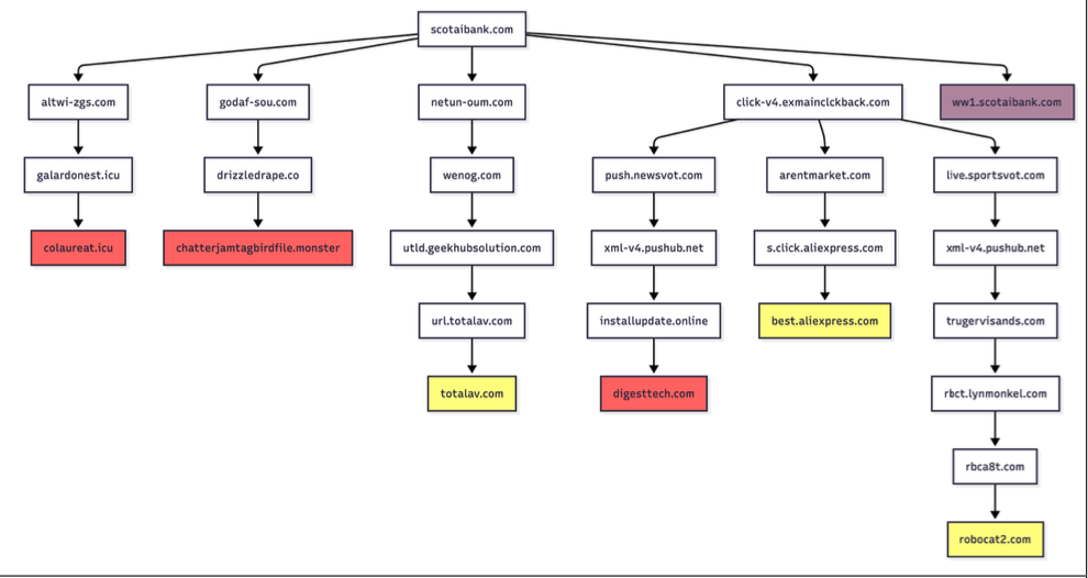 Samples of redirection paths when visiting scotaibank dot com. Each branch includes a series of domains observed, including the color-coded landing page. Image: Infoblox.