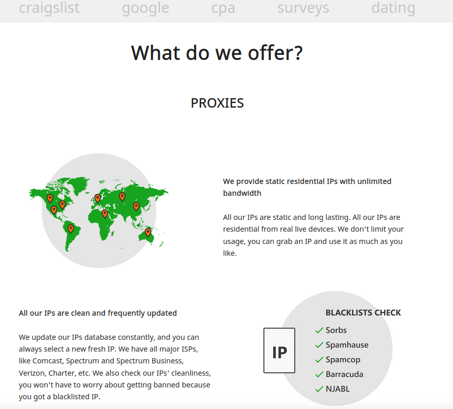 The SocksEscort home page says its services are perfect for people involved in automated online activity that often results in IP addresses getting blocked or banned, such as Craigslist and dating scams, search engine results manipulation, and online surveys.