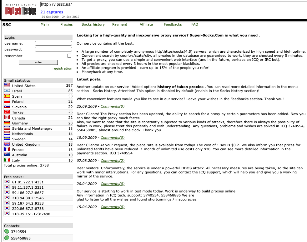 SocksEscort began in 2009 as “super-socks[.]com,” a Russian-language service that sold access to thousands of compromised PCs that could be used to proxy traffic. Someone who picked the nicknames “SSC” and “super-socks” and email address “michvatt@gmail.com” registered on multiple cybercrime forums and began promoting the proxy service.
