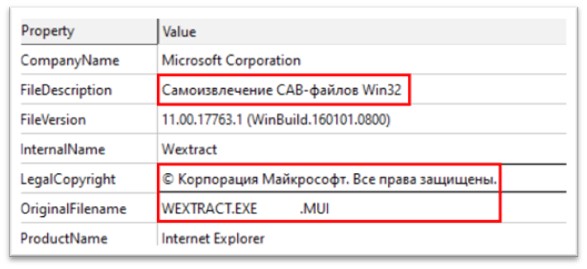 The file is a 32-bit Portable Executable file, which is 631.50 Kb in size. The original name of the file is WEXTRACT.EXE.MUI. The file description is “Самоизвлечение CAB-файлов Win32”, written in Russian, and means “Self-Extracting Win32 CAB Files”. The legal copyright mentions Microsoft Corporation. A lot of static strings of this file were found to be written in Russian.