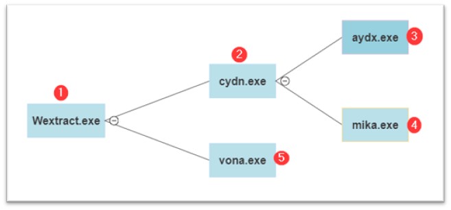 The order of file execution is as follows: First, Wextract.exe and cydn.exe, which have already been discussed, are followed by aydx.exe, and then by mika.exe and vona.exe.