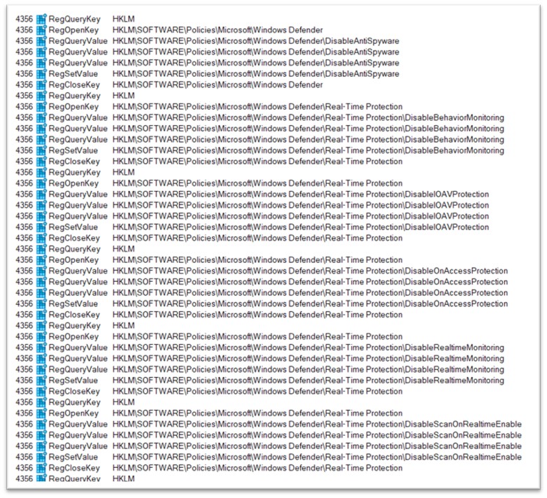 This setting was irreversible and couldn’t be turned back to on via settings of Windows. Following this, logs from Procmon were analyzed and there were entries regarding Windows defender, such as: