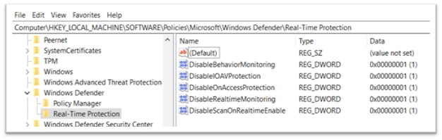 To validate this, Registry was analysed and all the changes were found there. The changes in Registry were found to be in exact order as of Procmon logs. In Windows, the registry is a hierarchical database that stores configuration settings and options for the operating system, as well as for applications and devices. It is used to store information about the hardware, software, user preferences, and system settings on a Windows computer. Following keys are added under Real-Time Protection: