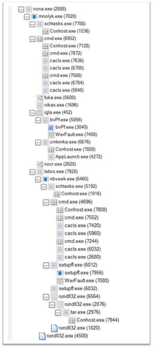Vona.exe, a variant of the Amadey malware family, is compiled in C/C++ and is 236 KB in size. This is the last file to be executed from the current cluster. When executed, a highly extensive process tree quickly appeared.