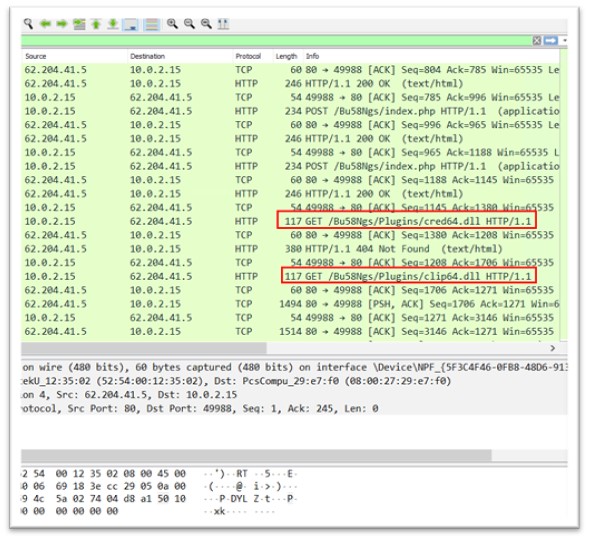 Malicious DLLs are downloaded from 62.204.41.5, which are executed later in the campaign. The target was made to search for two different DLLs, namely cred.dll and clip.dll.