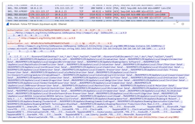 As a response, all the data residing at the specified paths is sent back to the C2 server of the malware. This includes all the profiles of different web browsers, information related to crypto wallets, and even user-related data from the Windows operating system. This process allows the C2 server to collect a vast amount of sensitive information from the infected system, which could be exploited by the attackers for malicious purposes.