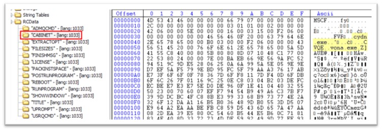 A CAB (Cabinet) file is a compressed archive file format that is often used to compress and package multiple files into a single file for distribution or installation. A CAB file in the resource section of a PE file can be used for various purposes such as storing additional program files or data, including language-specific resources, or compressing and storing commonly used resources to reduce the size of the executable.