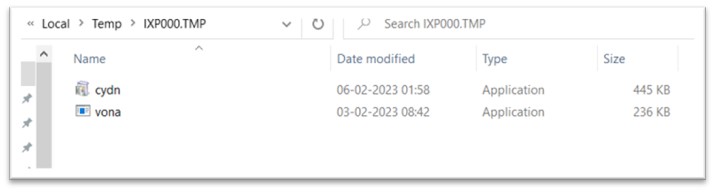 Once WEXTRACT.exe is executed, both cydn.exe and vona.exe is dropped in the TEMP folder. The TEMP folder is a commonly used location for malware to store temporary files and other data, as it is typically writable by any user account and is not usually subject to strict security restrictions. This can make it easier for the malware to operate without raising suspicion or triggering security alerts.