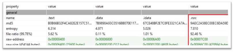 The file showed high file ratio of the resource section, with the entropy of 7.810. Entropy is a measure of the randomness or unpredictability of the data in the file. It is often used as an indicator of whether a file is likely to be malicious or not.