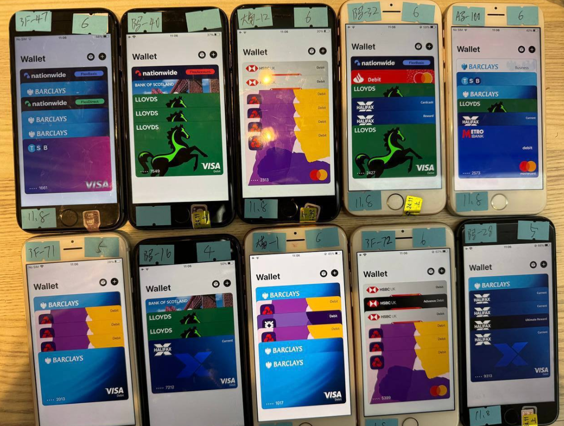 An image from the Telegram channel for a popular Chinese smishing kit vendor shows 10 mobile phones for sale, each loaded with 5-7 digital wallets from different financial institutions.