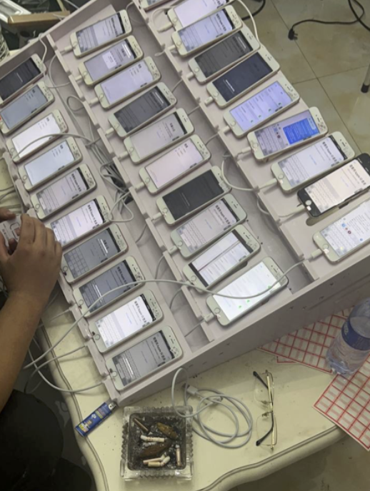 Merrill’s investigation into the Telegram sales channels for these China-based phishing gangs shows their phishing sites are actively manned by fraudsters who sit in front of giant racks of Apple and Google phones that are used to send the spam and respond to replies in real time.