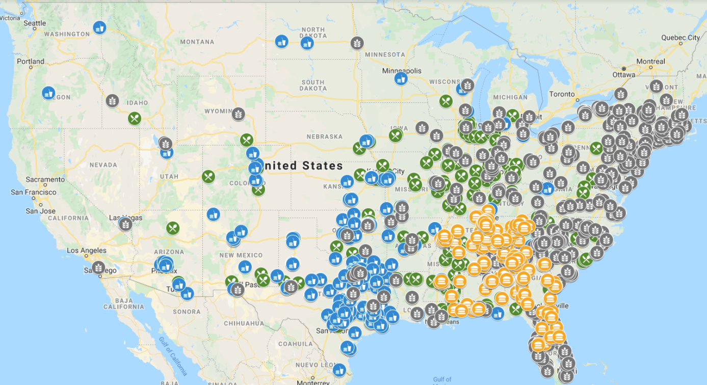 McAlister’s (green), Schlotzsky’s (blue), Moe’s (gray), and Krystal (orange) locations across the United States. There is an additional Moe’s location in Hawaii that is not depicted. Image: Gemini Advisory.