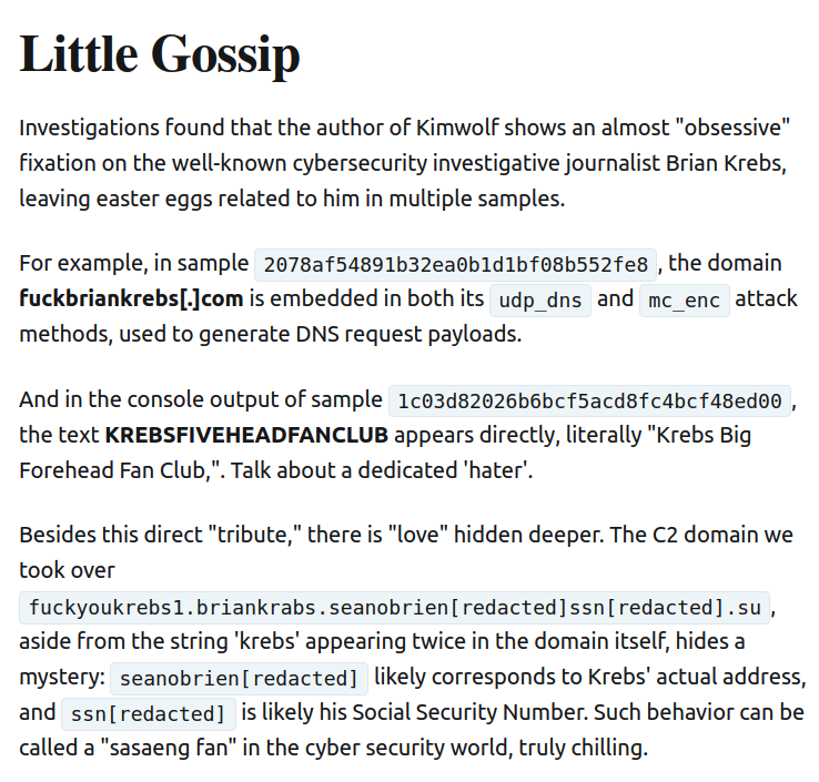 XLab noted that the Kimwolf author “shows an almost ‘obsessive’ fixation on Yours Truly, apparently leaving “easter eggs” related to my name in multiple places through the botnet’s code and communications: