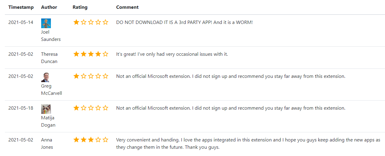 After hearing from a reader about a phony Microsoft Authenticator extension that appeared on the Google Chrome Store, KrebsOnSecurity began looking at the profile of the account that created it. There were a total of five reviews on the extension before it was removed: Three Google users gave it one star, warning people to stay far away from it; but two of the reviewers awarded it between three and four stars.