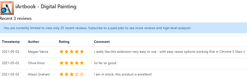 Google’s Chrome Store said the email address tied to the account that published the knockoff Microsoft extension also was responsible for one called “iArtbook Digital Painting.” Before it was removed from the Chrome Store, iArtbook had garnered just 22 users and three reviews. As with the knockoff Microsoft extension, all three reviews were positive, and all were authored by accounts with first and last names, like Megan Vance, Olivia Knox, and Alison Graham.