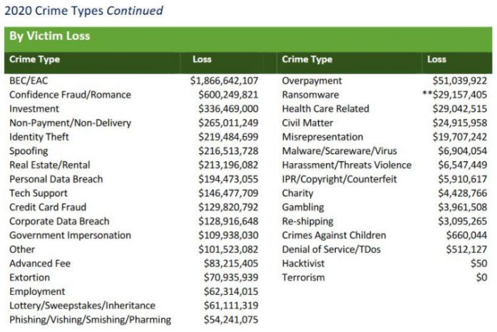 According to the latest figures (PDF) released by the FBI Internet Crime Complaint Center (IC3), the reported losses from BEC scams continue to dwarf other cybercrime loss categories, increasing to $1.86 billion in 2020.